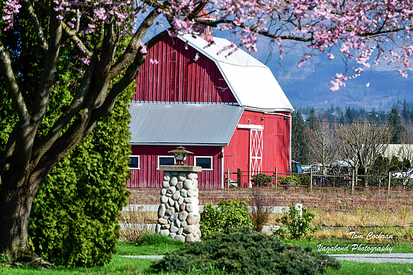 Apple Tree Pink and Barn Red. West of Mt. Vernon, Washington, the Skagit Valley is flat and fertile farmland. Apples, potatoes, corn, tulips, and berries grow in abundance. Many of the farms have traditional red barns. This image caught my eye because it was framed by the pink apple blossoms, a lovely contrast. March, 2016.