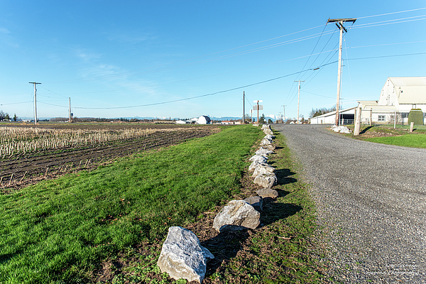 Trail of Rocks and Winter Cornfield. A gravel road lined with large rocks points to the horizon near Everson in Whatcom County. Winter corn stalk stubs in a farm field, left, wait for spring plowing. A clear blue sky stretches overhead. January, 2025.